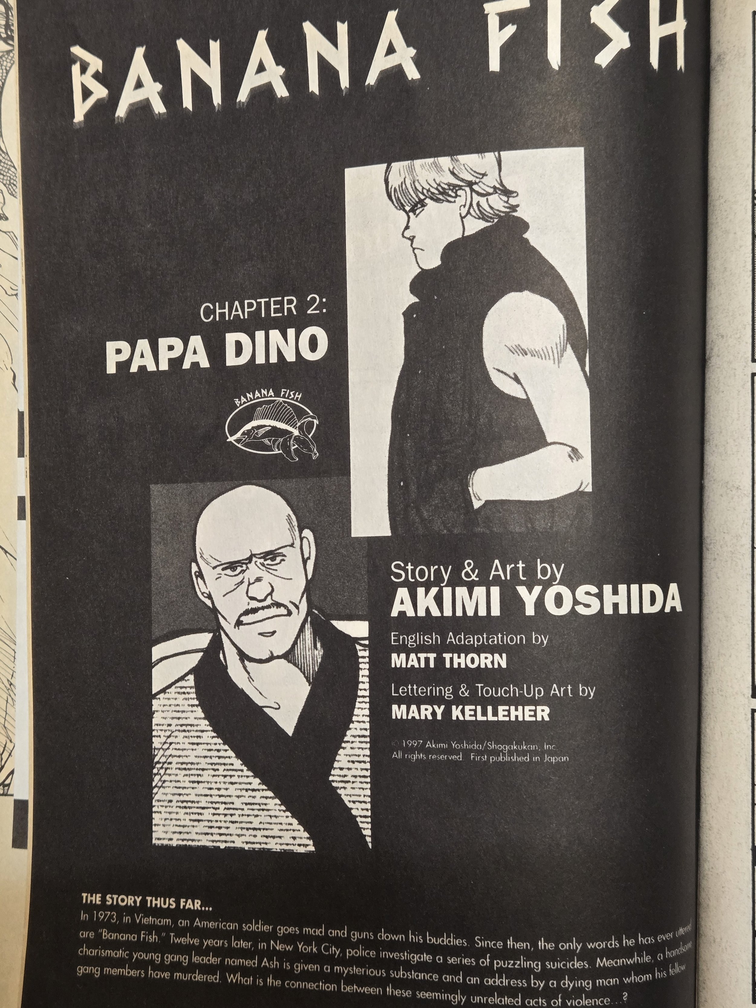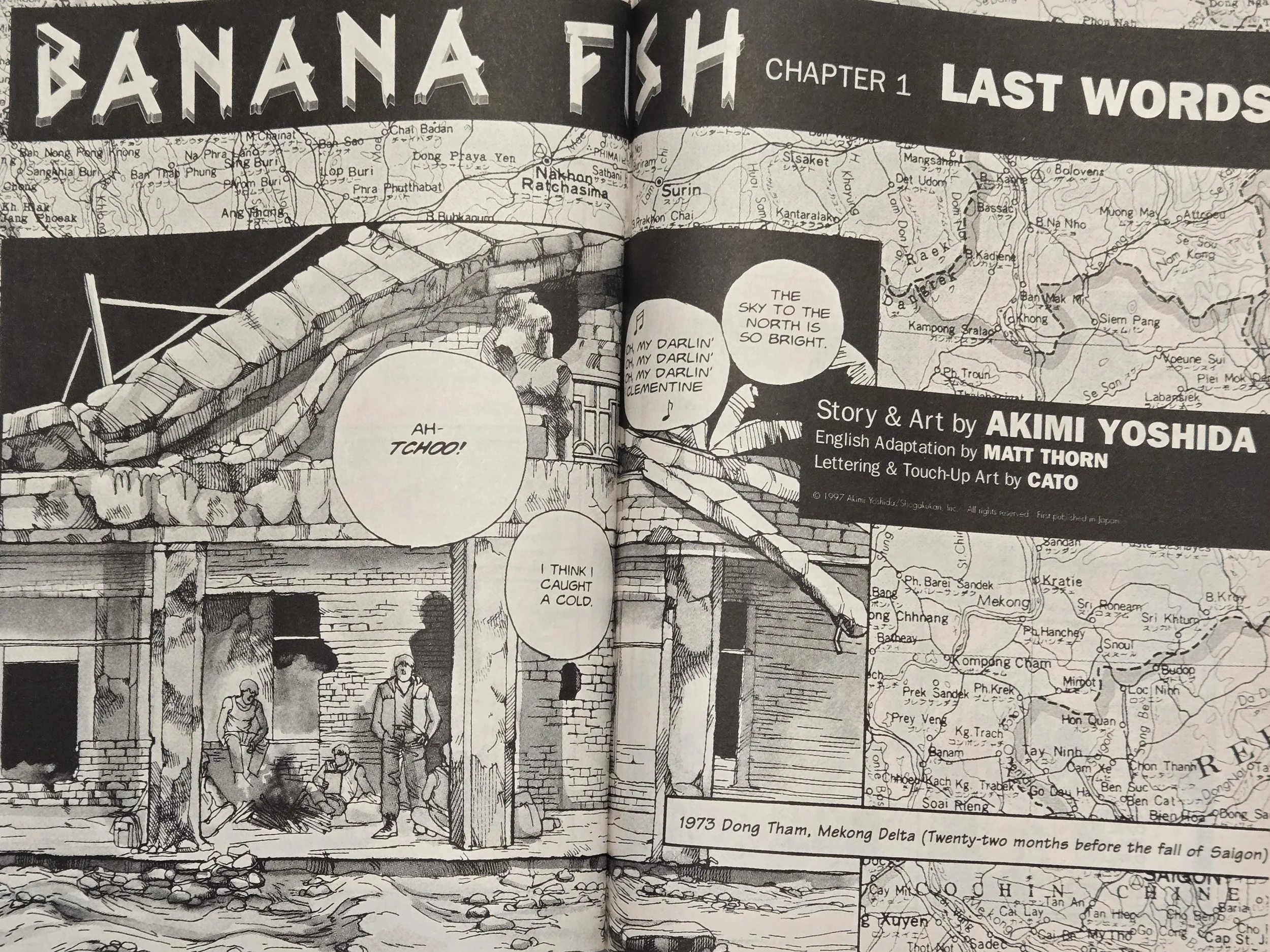 1973 Vietnam – US soldiers are relaxing in a half-destroyed building chatting about someone who died from a drug and singing. Griffin comes back from ‘taking a piss’ and starts firing at everyone with a machine gun. One of the soldiers is able to shoot him in the legs and get him to fall and stop firing. The try to get him to speak but all he says is ‘Banana Fish’.