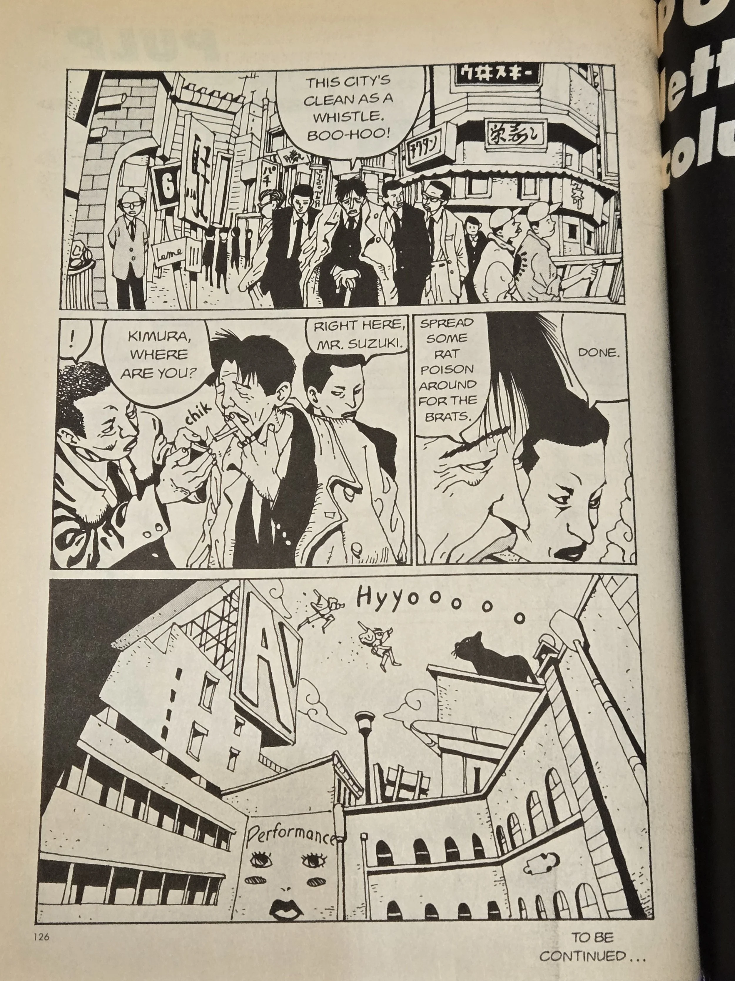 Black beats the man and the two of them get away just as the police arrive. White is happy they got the watch. Skirmish ends with us meeting Suzuki, he is telling a subordinate to spread rat poison around for the brats.