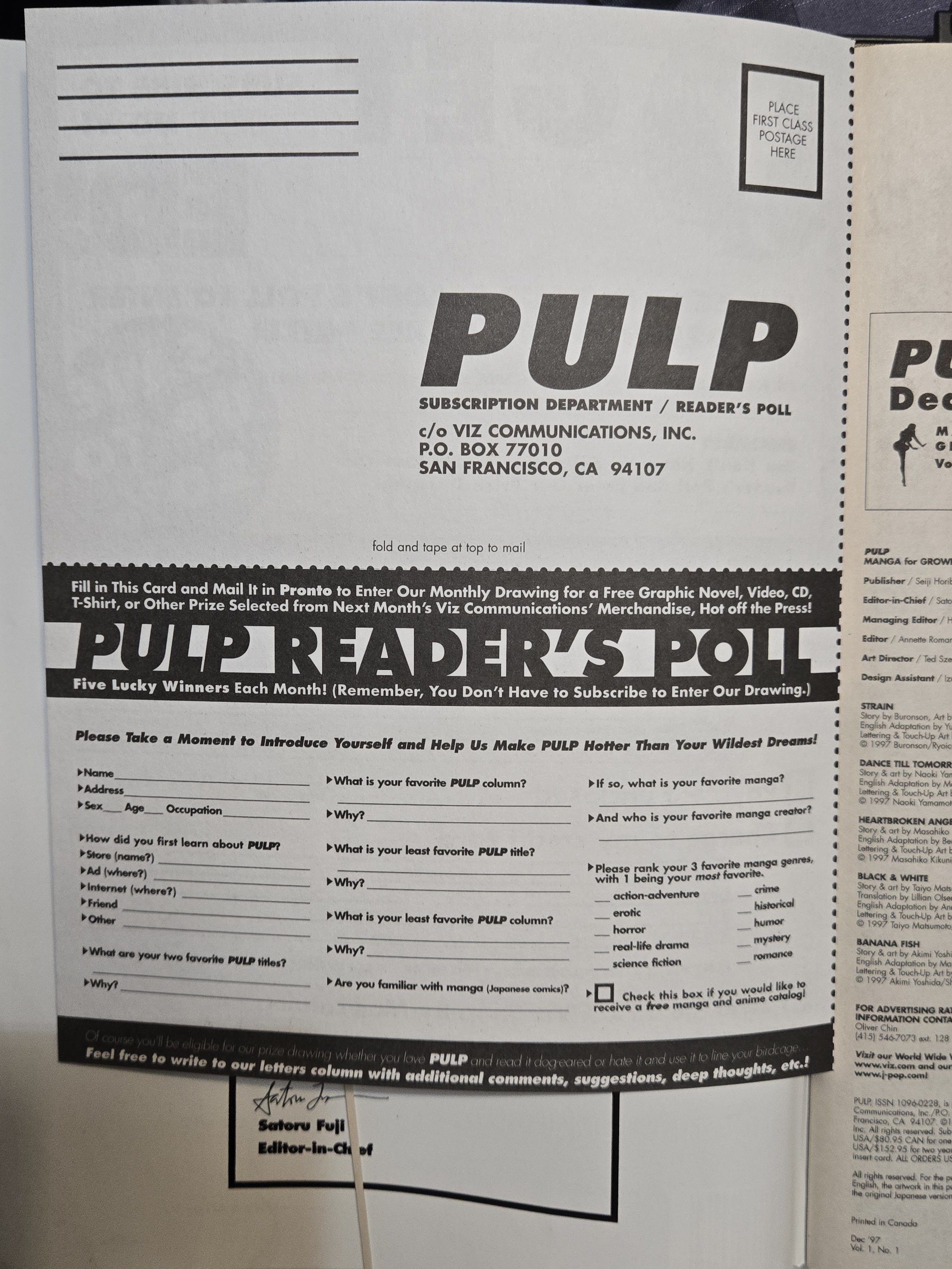 There are no letters from readers yet since this is the first issue. Instead this is a letter from PULP editor Annette Roman. She welcomes letters and fan manga art. She also announces a contest to name this column. If your entry gets chosen, you will win a 1 year subscription. There is also a giveaway for the first four letter writers. They will receive free strain phone cards. There was a third giveaway attached to a reader poll that was tipped into the front cover of this magazine. This poll is on the back of a subscription card